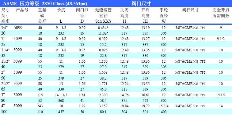 注:產(chǎn)品號(hào)5099 的閥門為焊接端部;產(chǎn)品號(hào)為5049 的閥門為承插焊接端部。